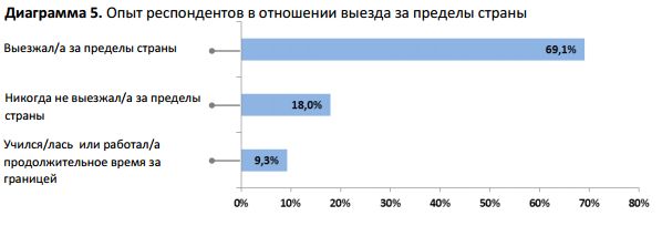 - Белорусы достаточно слабо вовлечены в глобальный контекст. Об этом свидетельствуют следующие данные: 69% респондентов отметили, что выезжают за границу, но не чаще одного раза в год; 9,3% имели опыт продолжительного (более 6 месяцев) проживания за границей; 61% опрошенных отметили, что не владеют ни одним иностранным языком